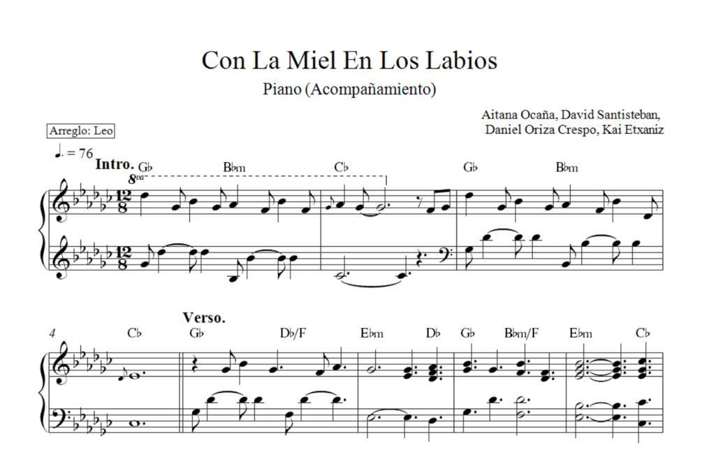 Partitura de mi arreglo de la canción Con La Miel En Los Labios, de Aitana. (Versión Acompañamiento)