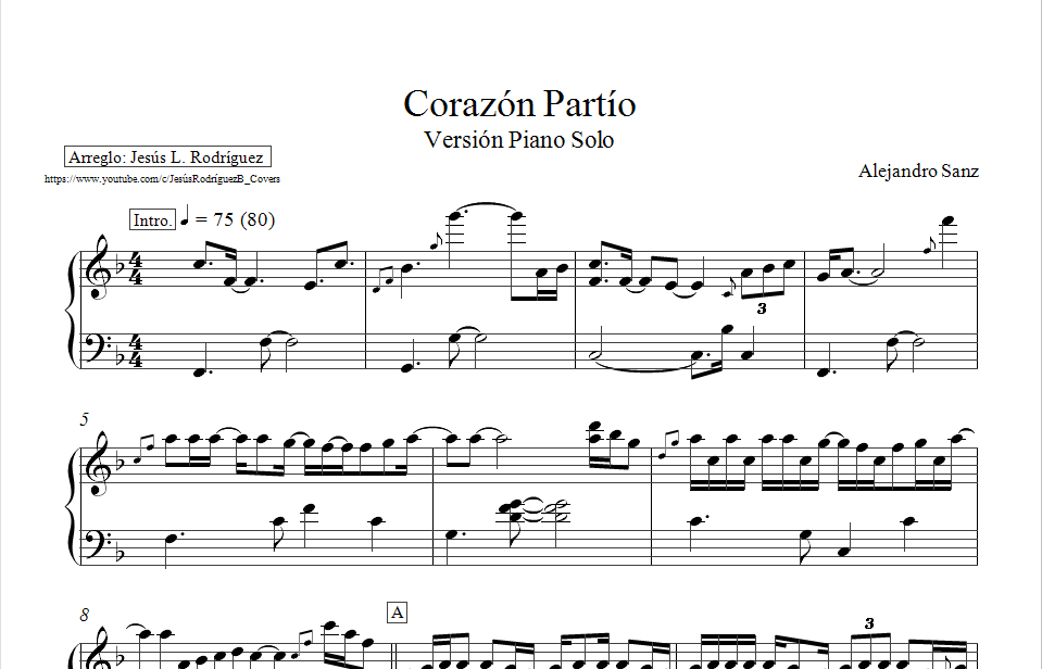 Partitura de mi arreglo de la canción Corazón Partío, de Alejandro Sanz.